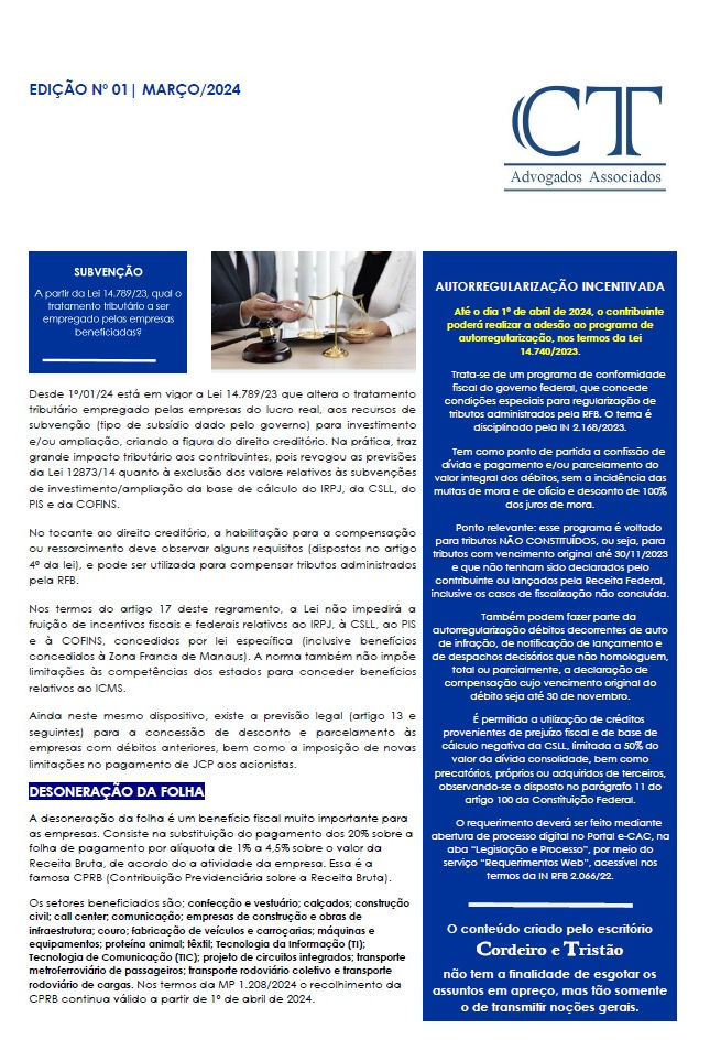 O Boletim Informativo "Pílulas Jurídicas", surgiu da demanda de alguns clientes em entender não apenas algumas das inúmeras alterações na legislação brasileira, mas também a complexa terminologia jurídica. O escritório Cordeiro e Tristão idealizou um formato simples, compacto e bastante direto, para tratar os assuntos mais buscados. O conteúdo publicado no boletim não tem a finalidade de esgotar os assuntos, mas tão somente o de transmitir noções gerais sobre os temas trabalhados.